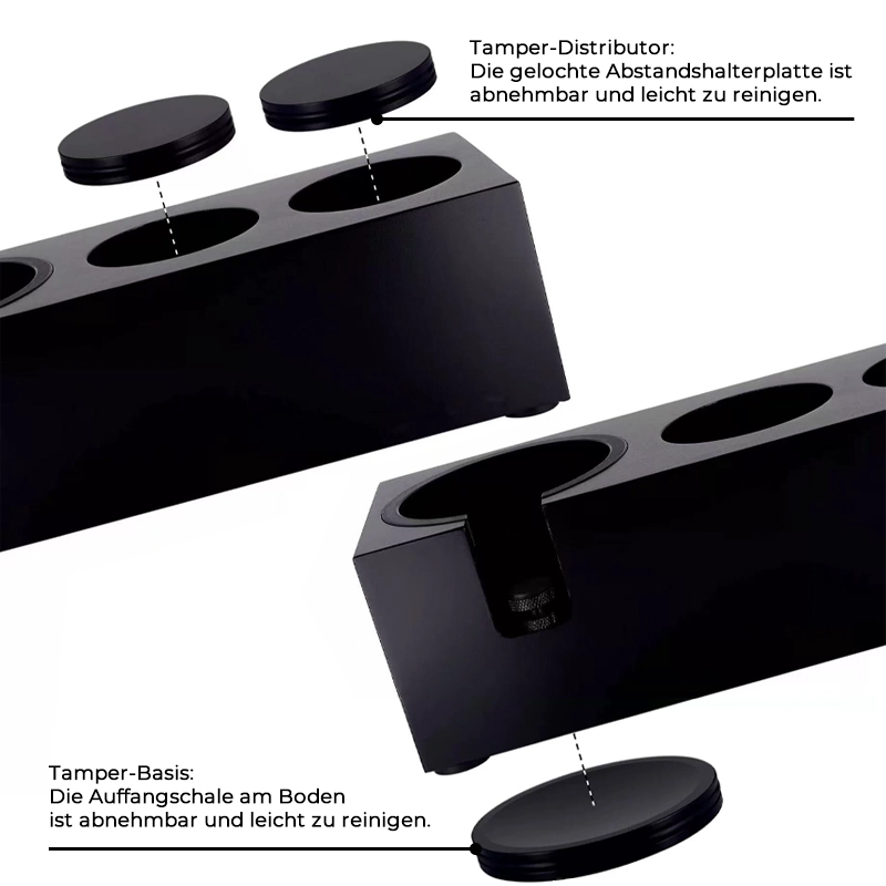 Das Bohnito 3-in-1 Tool Dock Steel hält Tamper, Distributor und Siebträger perfekt organisiert – und deine Station sauber. Aus massivem, pulverbeschichtetem Stahl – rutschfest, kratzfest, langlebig. Herausnehmbare Einsätze und Auffangschale für einfache Reinigung. Für alle, die Wert auf Ordnung, Präzision und Qualität legen.