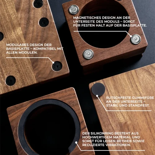 Dank des magnetischen Modulsystems lassen sich alle Teile sicher und flexibel auf der Basisplatte anbringen. Anti-Rutsch-Pads an der Unterseite sorgen für festen Halt, während der Silikonring im Halter Vibrationen dämpft und einen geräuscharmen Betrieb ermöglicht. Egal ob für ambitionierte Home-Baristas oder den professionellen Einsatz – diese Aufbewahrungslösung bringt Stil, Struktur und Effizienz in deinen Kaffeebereich.