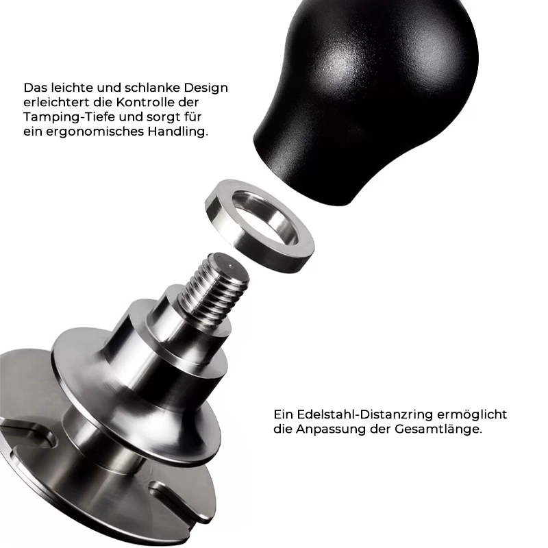 Die integrierte Feder sorgt für ein kontrolliertes Tamping-Gefühl und unterstützt dich dabei, den Tamper automatisch gerade zu halten. Der ergonomisch geformte Griff aus edlem Holz oder mattem Aluminium liegt perfekt in der Hand und ermöglicht müheloses Arbeiten auch bei hoher Tamping-Frequenz.