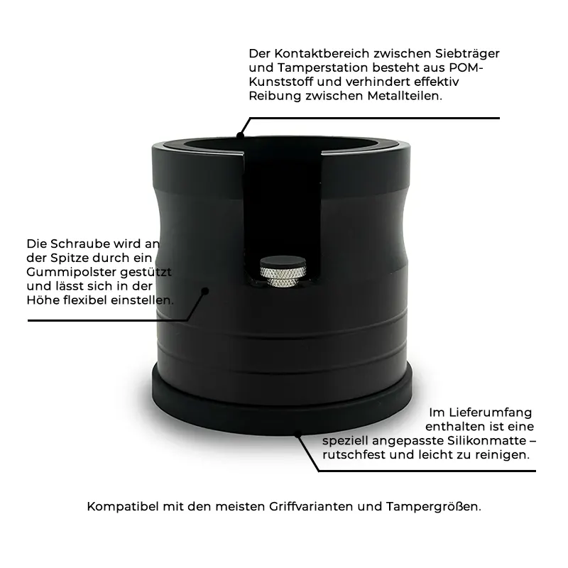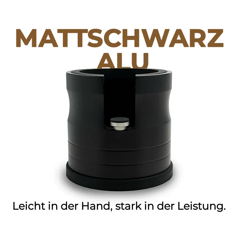Leichte und robuste Tamperstation aus mattschwarzem Aluminium. Sorgt für sicheren Halt des Tampers und schützt die Arbeitsfläche – funktional und stilvoll.