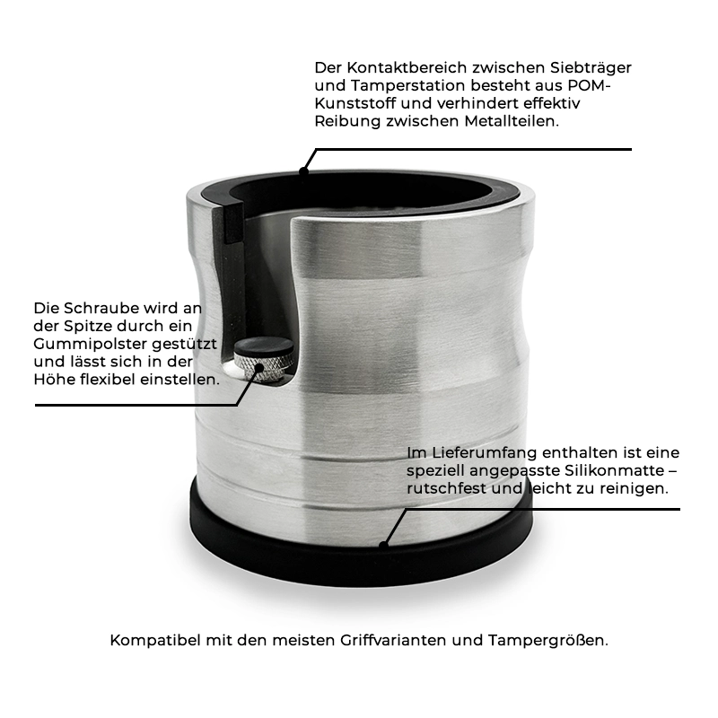 Diese schwere Tamperstation aus hochwertigen Komponenten vereint Stabilität, Funktionalität und Komfort – perfekt abgestimmt auf den anspruchsvollen Barista-Alltag.